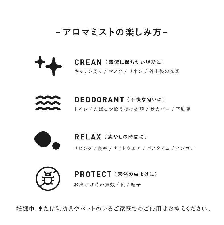 精製水、無水エタノール、香料(スイートオレンジ、ヒノキ、ペパーミント、ジュニパー、パルマローザ、サンダルウッド)